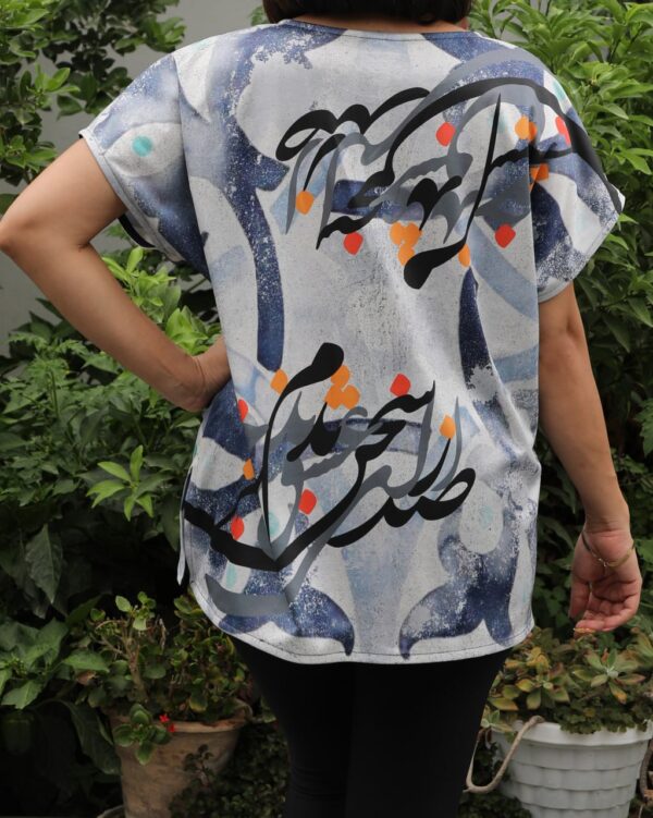 Embrace the beauty of Persian culture with this women’s shirt inspired by traditional Persian calligraphy. Designed for comfort and elegance, this free-size shirt flatters different body shapes while offering a unique artistic touch.