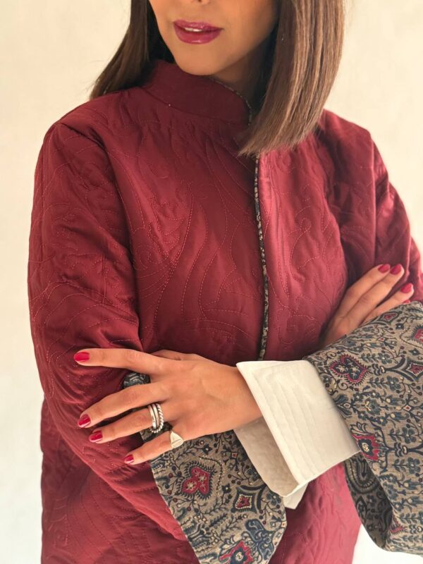 This reversible jacket features a beautifully detailed Persian-inspired pattern, carefully handcrafted to create a unique and timeless piece. Designed for versatility, you can wear it on both sides—each offering its own distinct look.
